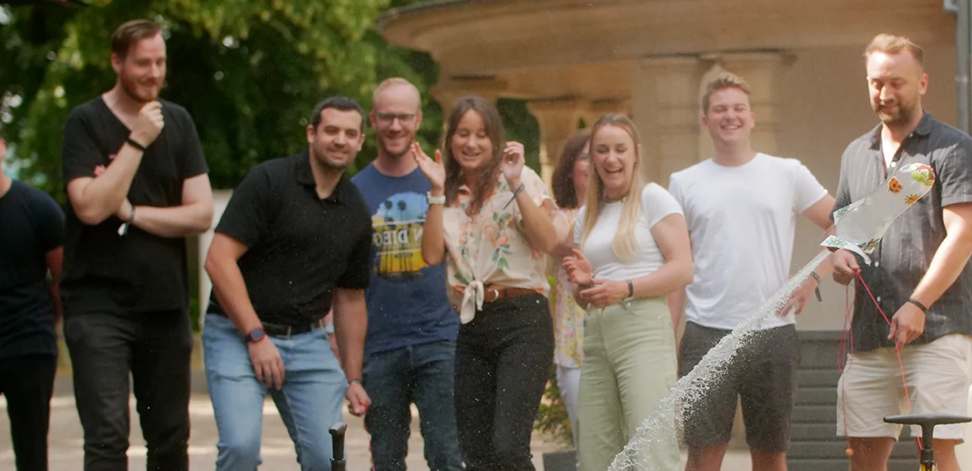 Beim Raketenbau-Event arbeiten die Teilnehmenden in Kleinteams zusammen, um eine flugfähige Rakete zu konstruieren und diese dann zum Abschluss des Events abzuschießen. Sie müssen verschiedene Herausforderungen bewältigen, um die benötigten Bauteile für ihre Raketen zu erhalten und diese dann unter Anleitung zu bauen.